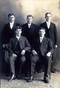 Saudabuar som gullgravarar i Douglas Alaska. Fotografiet er frå mellom 1906 og 1910. Originalen tilhøyrer Vrål Øverland. Framme frå venstre: Ivar Handeland, ukjend (mogleg ein frå Moatre). Bak frå venstre: Amund V. Øverland, Østen O. Årthun, ukjend