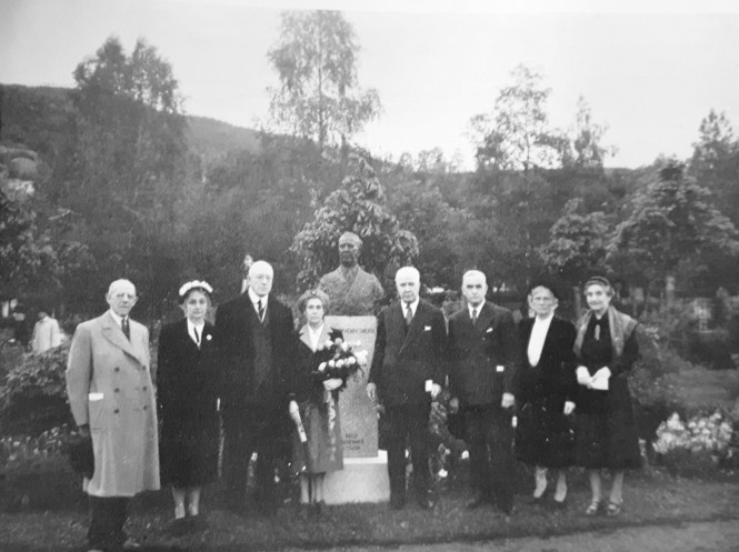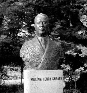 William H. Sneath var mannen som leia utbygginga i Sauda, og som vart den første direktøren på smelteverket. Han har slik sett sitt preg på Sauda, og det var ein av årsakene til at parken i Åbøbyen fekk namn etter han. Her har Sneath og vener stilt seg opp for fotografering etter avdukinga av bysta i parken. Frå venstre: Herr og fru Kerr, Mr. Morehead, Mrs. Sneath, Mr. Sneath, Advokat Christiansen og frue og Mrs. Morehead.