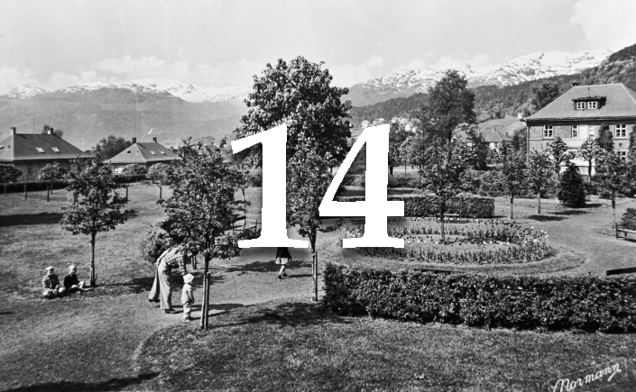 Sneaths park var eit flott postkortmotiv. Her er parken fotografert ein gong på 1950-talet. Foto: Normanns kunstforlag AS / Ryfylkemuseet.