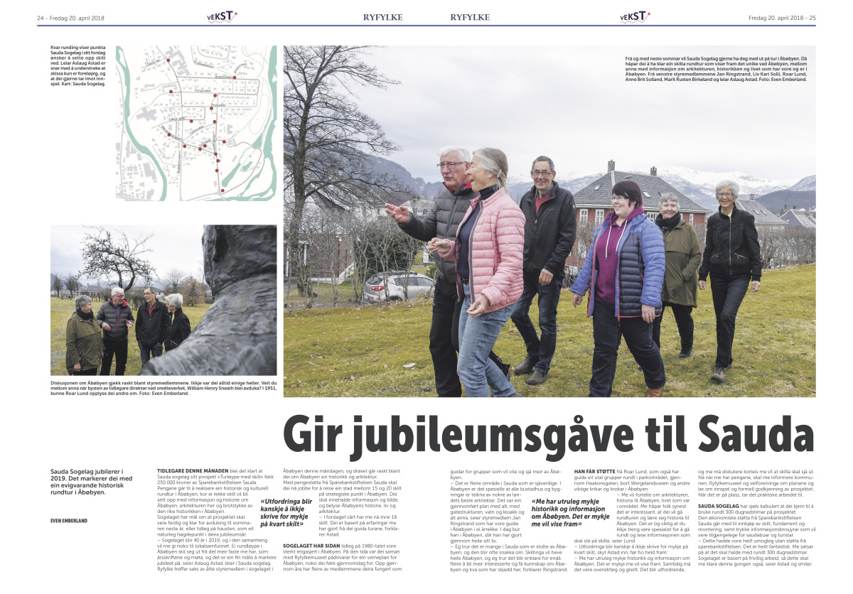 Eg trur det er mange i Sauda som er stolte av Åbøbyen, og den blir ofte snakka om. Skiltinga vil heve heile Åbøbyen, og eg trur det blir enklare for endå fleire å bli meir interesserte og få kunnskap om Åbøbyen og kva som har skjedd her.