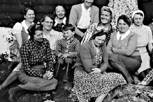 Utsnitt av bilete. I midten sit fru Sveen (ikkje fru Blegen). Kring henne sit Reidar Ljung, fru Ljung, fru Sommerhaug og fru Årebrot.