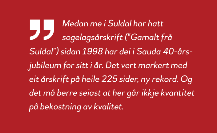 Medan me i Suldal har hatt sogelagsårskrift («Gamalt frå Suldal») sidan 1998 har dei i Sauda 40-årsjubileum for sitt i år. Det vert markert med eit årskrift på heile 225 sider, ny rekord. Og det må berre seiast at her går ikkje kvantitet på bekostning av kvalitet.
