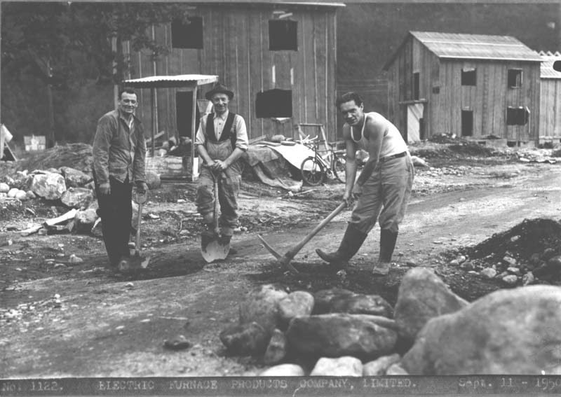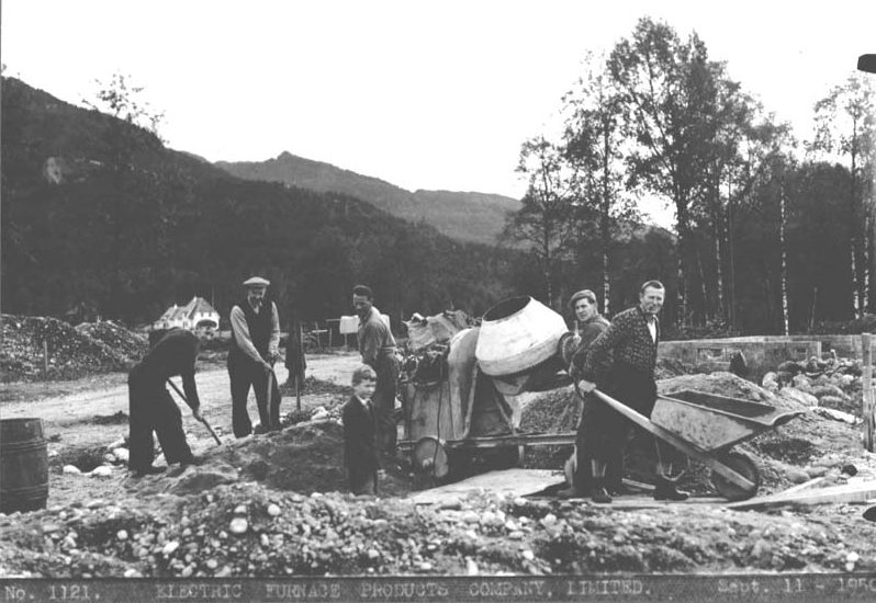 Her er Olav Fatland med en god støypegjeng under bygging på Egne Hjem på Birkeland. Egne Hjem var velregulert med fine gater og beplantning.