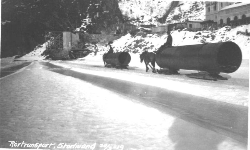 rørtr4 Publisert den 22. mars, 2018 kl. 800 × 481 på Foto: Røyrgater ← Forrige Neste → Transport av rør på Storlivann vinteren 1919.