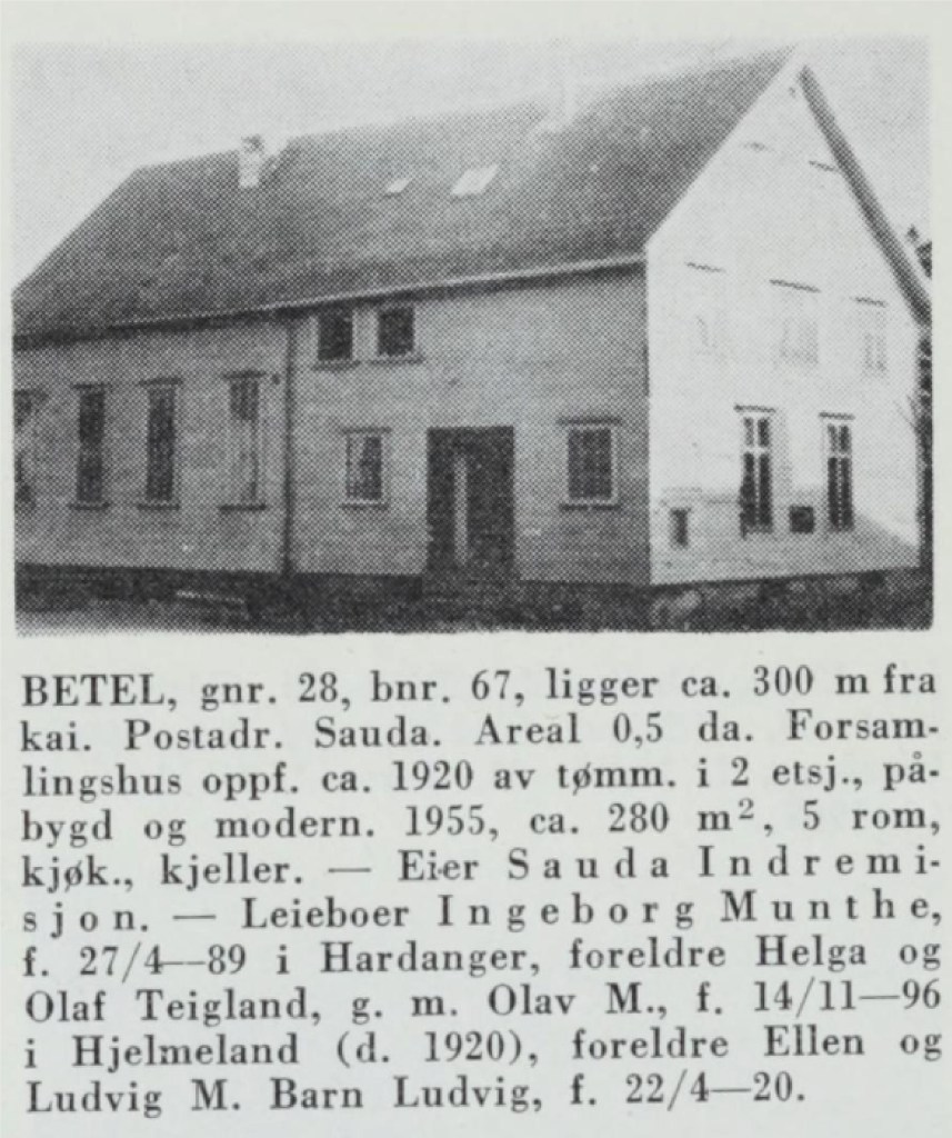 Njeld Lofthus laga teikninga til «Betel». Det var Ola Fløgstad som grov ut tomta og murte grunnmur, Øgreid-firmaet hadde byggearbeidet. Huset vart innvigd 6. november 1918. Fleire framståande teologar var til stades og kasta glans over stunda, _Johan Lunde, som då var sokneprest i Johannes kyrkjelyd i Stavanger og seinare (1922) biskop i Oslo, og Bernt Støylen, biskop i Agder 1914-1930. Men huset var blitt innvigd og tatt i bruk før det var heilt ferdig. Så langt hadde det kosta 72830 kroner. Hausten 1919 kom bordkledningen på, og vinteren 1919-20 vart det innlagt elektrisk ljos. Økonomien var vanskeleg mange år framover. Mange trufaste vener av bedehuset måtte «trø til» med personleg lån og pengegåver til huset. Leigeinntekt fekk dei av frisørmeister Jens Emil Aarvik som hadde salong i første etasje. Han kom til å vera der i nær 40 år, til 1959. Rolf Garstad byrja hjå Aarvik i 1931 og arbeidde der til 1941. Det året byrja Nils Aahø i lære. Dei dreiv seinare begge eigne frisørsalongar i Sauda. Elles vart eit husvære i andre etasje også leigd bort.