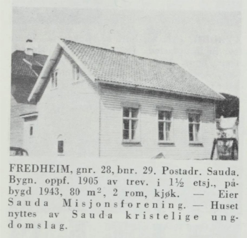 Tomta til «Fredheim» vart skilt ut i 1904, og huset bygt året etter. Då hadde nok misjonsvenene lenge sakna eit hus å vera i. «Søvde Misjonsforening» vart nemleg skipa alt i 1842, og den første kvinneforening vart til i Saudasjøen i 1852. Til møtene i Saudasjøen kom misjonskvinnene frå Indrebygda «roande og gåande», skriv Ludvig Munthe. «Vegane var lange og rokkane tunge», og det enda med at Indrebygda skipa eiga forening. Arbeidet for misjonen tok seg godt opp etter at «Fredheim» vart tatt i bruk i 1905. Misjonsmotene vart haldne der. «Fredheim Kvinneforening» var sers flittig brukar av huset. Etter berre 10-12 år vart huset for lite. Nye religiøse organisasjonar byrja å arbeide i Sauda, og folketalet auka i anleggsåra 1915-1917. Straks etter at Indre Sauda Indremisjon var blitt skipa i 1918, vart det sett ned ein bygningskomite «for oppførelse av nytt bedehus» med Njeld Lofthus som formann. Det var elles Landsindremisjonen og Ryfylke og Jæren Indremisjon som hadde vore pådrivarar.