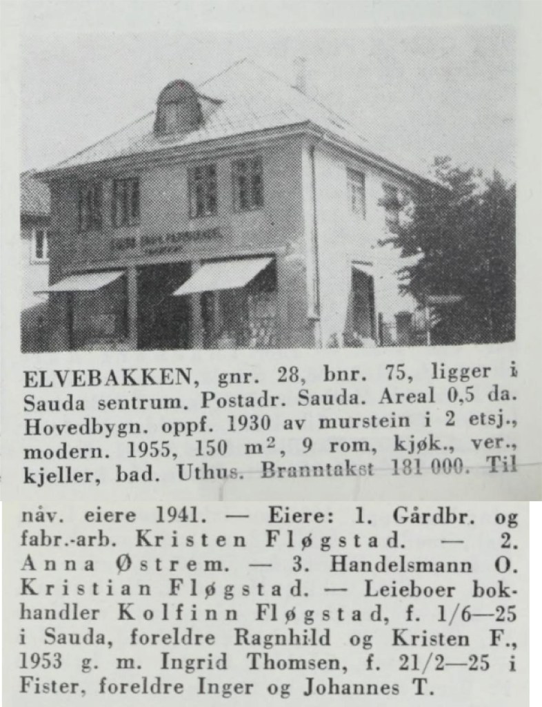 Ola Fløgstad reiv det vesle huset og bygde eit heller stort murhus i 1930. Det var Stavanger-arkitekten Erik Erga som teikna huset. Murmeister Jonas Solheim hadde hovudentreprisen. Firmaet Otto Bjørnsen & Co., Stavanger, leverte mykje av det innvendige utstyret. Øgreid-firmaet tok seg elles av trearbeidet, og J. L. Vandvik var bygningsinspektør. Bokhandelen opptok første etasje, og i kjellaren var det lagerrom. I andre etasje var det husvære. Huset kosta vel 32.000 kroner, og då var ikkje alt inventar rekna med. Eit vanleg bustadhus kom på ca 14.000 kroner på den tid.