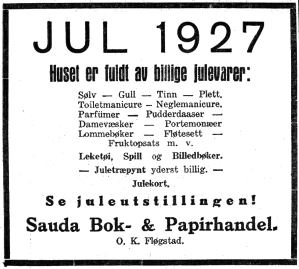 Sauda bok- og papirhandel vart etablert i 1916 av Ragna Olsen Grønlund frå Hønefoss. Ho hadde då arbeidd ei tid i Floor sin bokhandel i Stavanger. Bokhandelen heldt først til i det eine forretningslokalet i skomakar Øverland sitt hus i Rådhusgata. I 1918 kjøpte ho gnr. 28, bnr. 53 (Kolbenshaug) lenger oppe i gata, som Ole Seim kjøpte nokre år seinare. Sauda Sparebank ville ikkje gi henne det pantelånet ho hadde søkt om. Noko som resulterte i at ho flytte bokhandelen til eit lite tømra hus som Hallvard Rafdal hadde sett opp i 1919, omtrent der bokhandelen er i dag. Der hadde han drive plantesal. Det var ikkje berre bøker Ragna Grønlund handla med. Ho selde bl.a. kosmetikk. Ein eller annan hadde oppdaga at sume parfymar inneheldt sprit, og då greip sjølvsagt heradsstyret inn. Slik styggedom ville dei ikkje vita noko av.