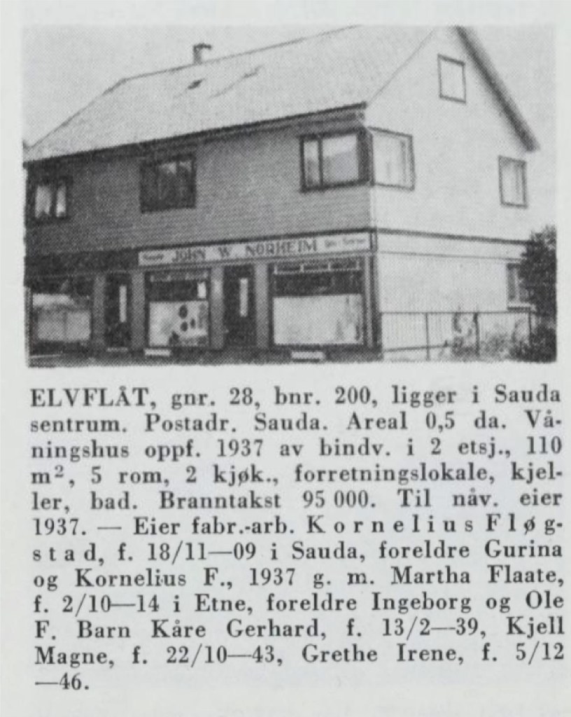 Me skal så konsentrera oss om ein omtale av forretningslokala i fyrste høgda. Den som fyrst leigde det største lokalet — bak den søndre inngangsdøra – var manufakturhandlaren J. W. Norheim. Han hadde ein god handel i dette lokalet. Norheim heldt til her fram til fyrste halvdel av 1970-åra dån fann ut at han ville utvida vareutalet og derfor hadde bruk for eit større forretningsareal, Han flytte forretninga opp til «Rydningen-huset», der «Spareland» held til nå.