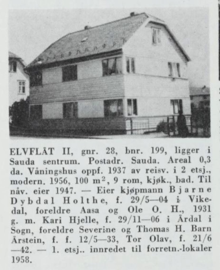 I 1942 seide Geelmuyden huset til bokhaldar Helge Havik som hadde bygget til 1947, då det vart kjøpt av eigaren til Grand kolonial («varelageret»), kjøpmann Bjarne Dybdal-Holthe, som saman med kona Kari (f. Hjelle) og barna Årstein og Tor Olav flytte inn i det eine husværet i andre høgda. I 1956 gjorde Dybdal-Holthe ei ombygging. Fyrste høgda vart ominnreidd til forretningslokale. Den som fyrst opna forretning her, var Georg Stang. Han dreiv bok- og papirhandel i huset i fleire år. Då han avvikla verksemda si i 60-åra og reiste til Bergen, var det Sauda Elektriske Forretning som overtok lokalet og brukte det hovudsakleg som avdeling for fjernsyns- og radioapparat.