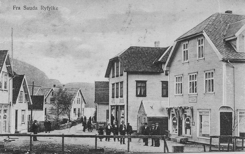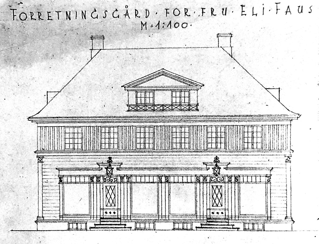 Fyrste høgda inneheldt to romslege butikklokale. Alfred Vetti, som hadde byrja som kjøpmann i Årdal i Sogn allereie i 1923, heldt fyrst til i sjøhuset på kaien – Vangnes – då han kom til Sauda i 1928. Frå 1930 leigde han det austre forretningslokalet hjå Eli Faukse. Ein bergensfamilie, Sjusen, bruktet det andre som kafé. Men det var nedgangstider i Sauda fyrst i 1930-åra, og då kafédrifta ikkje var lønsam, la huslyden Sjursen ned verksemda. Då byrja Eli Fauske si eiga kaféverksemd og gav kaféen namnet Sportskaféen. Men det var ikkje så liketil å sitja med eit stort hus og driva si eiga verksemd i dei åra. Ho selde huset og la ned kafédrifta i 1936 og reiste til Oslo saman med barna. Maud fortel at før dei reiste, vart konfirmasjonsgjestebodet hennar halde i kaféen.