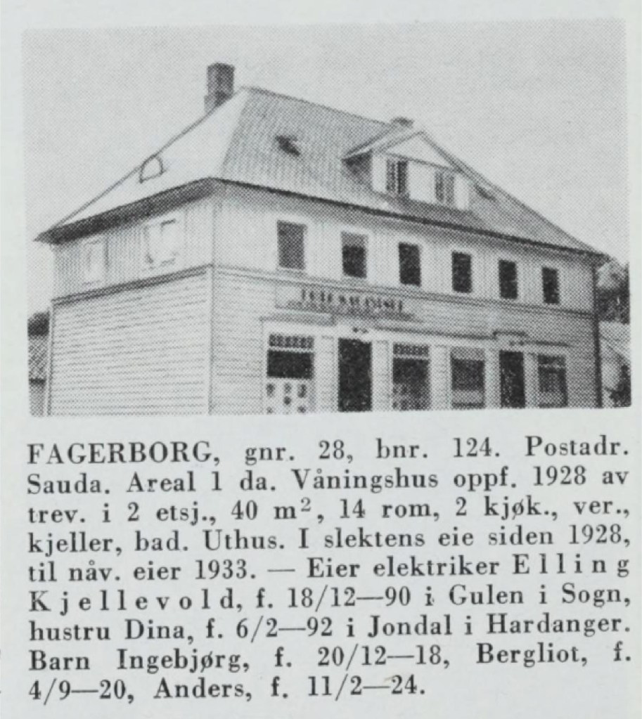 «Fagerborg» er eit kombinert forretnings- og bustadhus som ligg ved Rådhusplassen. Eli Fauske – fødd Handeland – kjøpte byggjegrunnen hjå gardbrukar Daniel Fløgstad i 1929 etter at ho vart enkje og måtte flytta frå husværet i Åbøbyen. Etter det dottera Maud Langeland opplyser, vart huset bygt etter teikningar mor hennar hadde kome med utkast til. Eli og barna hennar – Maud og Sverre – flytta inn i 1930 og valde å bu i det vestre husværet i andre høgda, medan huslyden Alfred Vetti flytta frå Åbødalen og leigde det andre husværet i same høgda. Ludvig Vetti og Ingvald Øren hadde kvar sine rom i loftsetasjen.