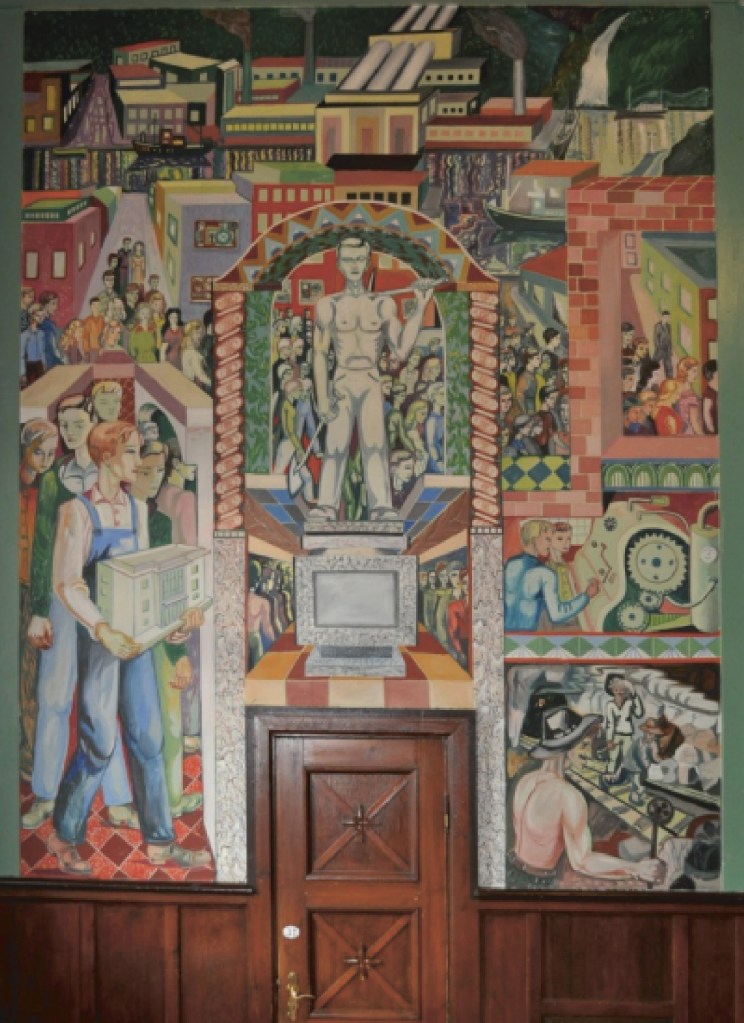 Veggmaleriene i storsalen er en særlig attraksjon. De er utført av Ragnvald Eikeland og Håkon Landa i 1953. Selv om maleriene altså ikke er fra byggeåret, er de noe av det mest kjente og kjære ved huset. Gjennom deres symbolske formspråk og innhold avspeiler de arbeidernes vilkår og historie. Det har gjennom tidene vært en utfordring å bevare maleriene, men ulike tiltak for klimastyring skal nå sikre så gode bevaringsforhold som mulig.