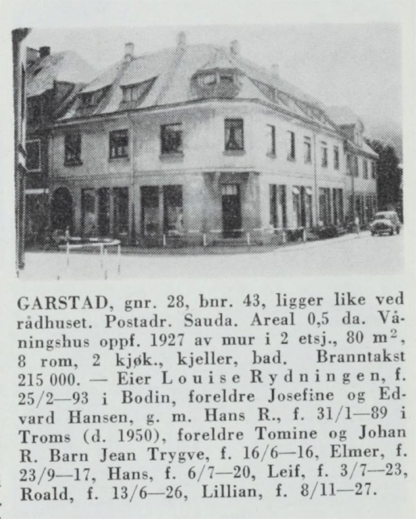 Mange vil sikkert stussa over namnet på denne eigedomen. Har huset det har skal skrivast om, noko å gjera med familienamnet Garstad? Ja, det har faktisk det. Avdøde Anders Garstad kjøpte i 1916 ei tomt hjå Aamund Søndenå, som tidlegare hadde kjøpt eit vidt areal hjå gardbrukar Daniel Fløgstad på Øyra. Men det var ikkje Garstad som kom til å byggja på tomta han kjøpte. I 1921 selde han byggjegrunnen til Bent Dybing og Hans Rydningen. Dernest overlet Dybing sin halvdel til Rydningen. Derfor var det den sistnemnde åleine som kom til å sitja med den verdfulle tomta, og som seinare sette opp det store murhuset i sentrum av Øyra.