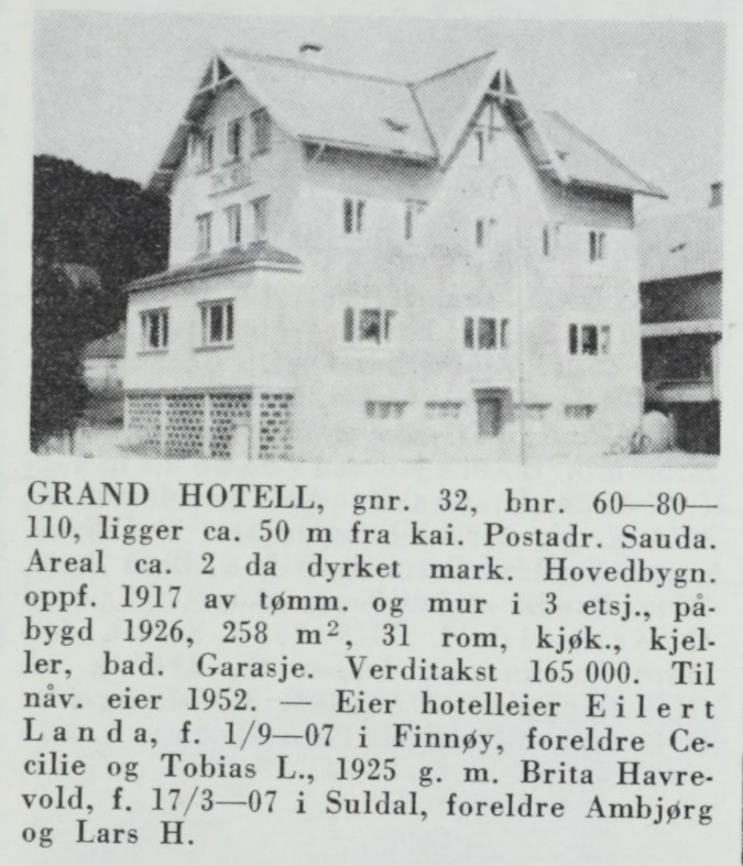 Då forløparen for lokalbladet «Ryfylke» -«Ryfylke-Posten» – tok til å koma ut i mars 1919, gjekk denne annonsa att i bladet: «Grand Hotel, Saude. Mottar faste gjæster.» Frå oktober same året vart annonsa noko brigda: «Grand Hotel, Sauda. Restaurant i første etage. Eget Skrædderverksted.»