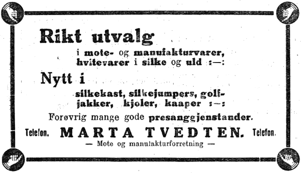 | Bruk: Skreddar, bokhandel, klesforretning, skobutikk, skomakar, ølagentur, brødutsal, bakeri, fiskehandel, sportsforretning, frukt- og tobakksbutikk, foto- og rammeforretning. |
