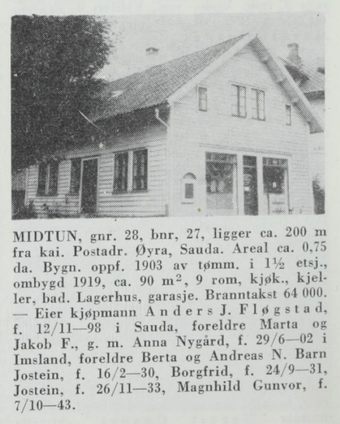 Huset vart bygt i 1898. I huset er det både forretningslokale og husvære i første etasje. Eigar var Jakob Andersson Fløgstad, byggmeister var Jakob Ringhagen. Jakob Fløgstad, som var fødd i 1848, hadde i yngre år drive med krøterhandel saman med Krister Olsson Fløgstad. Begge byrja seinare med landhandel på Øyra, Kristen i 1887, Jakob i 1898. Sistnemnde døydde i 1919, og kona Marta (f. Åbø) dreiv handelen vidare under same firmanamnet. I 1923 tok sonen Anders (f. 1898) over. Det vart då gjort visse endringar i forretningsdelen i huset. Det hadde då lenge vore ein velassortert landhandel, som i tillegg til daglegvarer kunne tilby steintøy og klede, ja, som i dei fleste landhandlar kunne ein få nær sagt alt frå knappar til kraftfôr. Parafin var også ei viktig vare, men salet minka av frå 1920-åra då det etter kvart vart vanleg med elektrisk ljos.