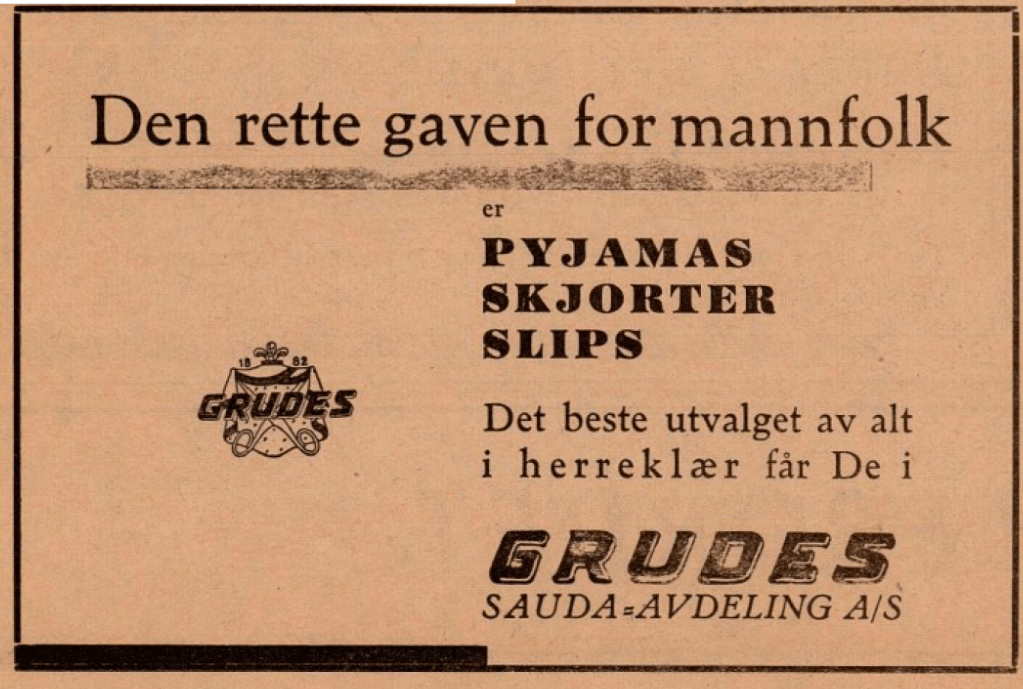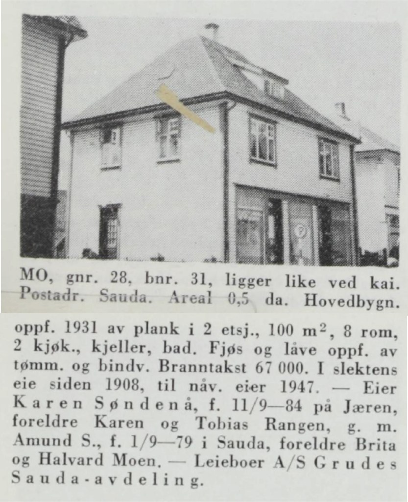 Huset er eit kombinert forretnings-og bustadhus som vart bygt i 1929. Det har to høgder og ein loftsetasje. l fyrste høgda er naturleg nok forretningslokalet, og her bar det gjennom åra vore ein livleg handel. Den 8. april 1929 kunne saudabuen lesa denne annonsa i bygdebladet «Ryfylke»: «Vi har aapnet egen avdeling i Sauda for vore anerkjente Færdige Herreklær og Herreklær efter Maal. GRUDES Sauda-avdeling A/s». Konfeksjonsfirmaet Grudes i Stavanger opna filial i Sauda i det nye huset til Amund Søndenå. Sandsbuen Rasmus Nerheim var sjefen i Sauda, og med seg hadde han i årevis Erik Johnsen inntil denne opna eiga manufakturforretning i Rådhusgata.