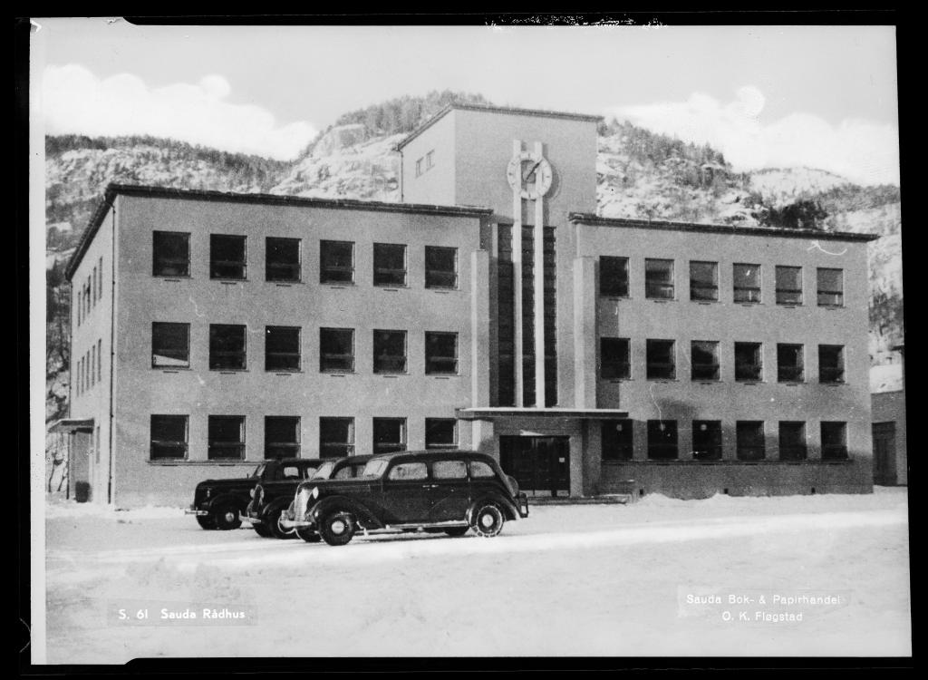 Den første byggekomitéen vart oppnemnd i 1928. I 1931 vart grunnmuren ferdig. Men meir vart det ikkje gjort. Det var krisetid. Kommuneøkonomien var svak. I 1936 vart det sett ned ein ny komité med I. Ellefsrød som formann. Det er arkitekt Gustav Helland, Stavanger, som har teikna Rådhuset. Han var utdanna i Tyskland, hadde hatt praksis både der og i England før han slo seg ned i Stavanger og vart den leiande arkitekten i heimbyen. Han fekk etter kvart mange oppdrag i Sauda. Ein stor del av teikningane til husa i Åbøbyen er laga av Helland og medarbeidarane hans. Det gjeld også sjukehuset og Sauda Klubb. Grunnarbeidet starta i oktober 1937. Grunnmuren frå 1931 måtte utvidast. Frå våren 1938 vart det arbeidd på bygget kvar dag, så å seia. På tomta rett framfor grunnmuren til Rådhuset sto det såkalla Provianteringshuset, eit lagerbygg som det kommunale provianteringsrådet hadde sett opp i samband med matnauda under og like etter første verdskrigen. Det sto opphavleg nær kaien, men vart seinare flytta opp på «Kommuneløkkja», eller Torget, som staden seinare vart kalla. Det vart delvis nytta som rådhus og delvis som skulehus til 1926 og vart rive hausten 1939.