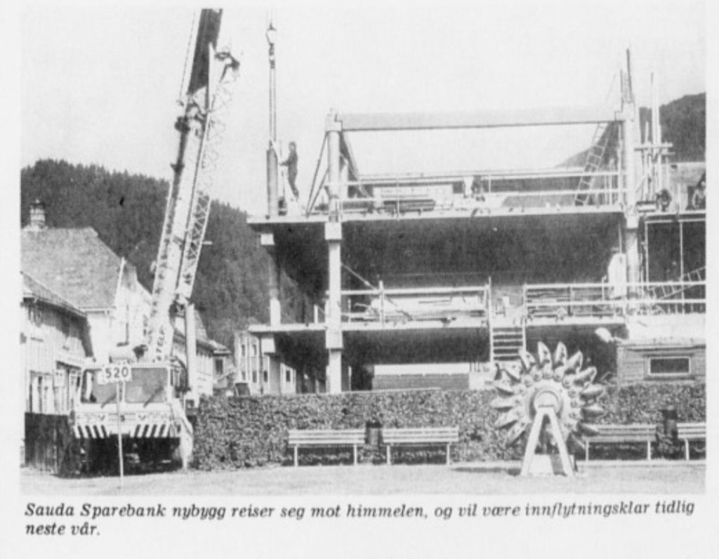 Ved å kjøpa eigedomane fekk banken ei byggjeflate på 1500 kvm. Arbeidet byrja i mars 1986. Øyvind Opedal ved «Spama» (Sparebankmateriell) var hovudarkitekt. Ingeniør Audun Tenden var byggjeleiar. Den nye bankbygningen var klar til innflytting i juni 1987. Sauda Sparebank kunne såleis i 1992 feira hundreårsjubileum i ny, stor bygning og tidsmessige lokale. I samband med jubileet vart skulpturen «Skuleborn», laga av Svein
