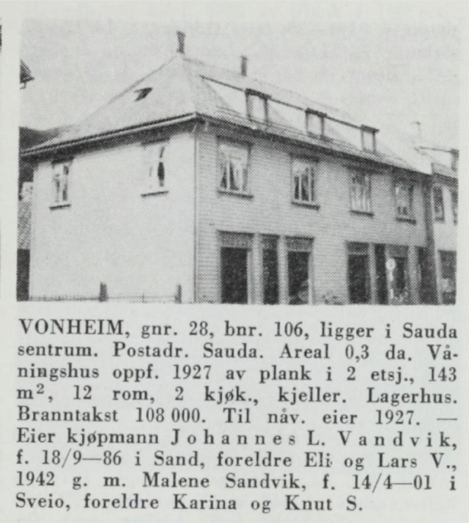 Johannes Larsson Vandvik, f. 1886, var bondeson frå Ytre Vanvik i Hylsfjorden. Men då han hadde eldre brør, kom det ikkje på tale for han å overta garden heime. Johannes valde snikkaryrket, og i en alder av 37 år vart han også handelsmann. Han starta «J. L. Vandvik, Snekker og Møbelforretning» i 1923. Og etter nokre ar kjøpte han eigedomen «Vonheim» i Rådhusgata, der han bygde eit kombinert bustad- og forretningshus i 1927. I første etasje, i forretningsdelen, fekk han god plass for alt det verksemda omfatta. Det var i første rekke møblar, men også tapet, golvbelegg og møbelstoff. Ein møbeltapetserer arbeidde hjå han ei tid. I andre etasje var det frå først av to husvære og eit kontor. Sakførar Rasmus Rasmussen leigde det, og likeins Magnus Gramstad. Sigrid Våge Håheim hadde systove i 2. etasje ei tid. I forretningsdelen var det også eit lokale til utleige, og det leigde Sauda Elektriske Forretning, ved Martin Bakka, i heile 30 år.